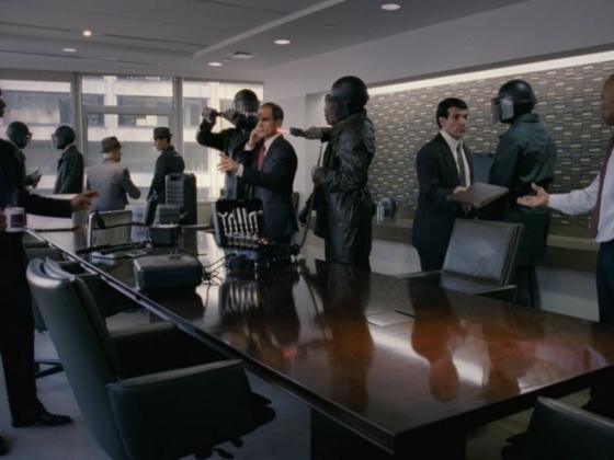 フルフェイスの黒ずくめの男たちがデヴィッドの仕事仲間たちを“調整”している場面は『マイノリティ・リポート』のようだし、彼を追うソフト帽の男たちは暗黒街を描いた昔のフィルムノワールやアメコミ、これまた無数のサスペンス映画に登場するキャラクターたちを連想させる。